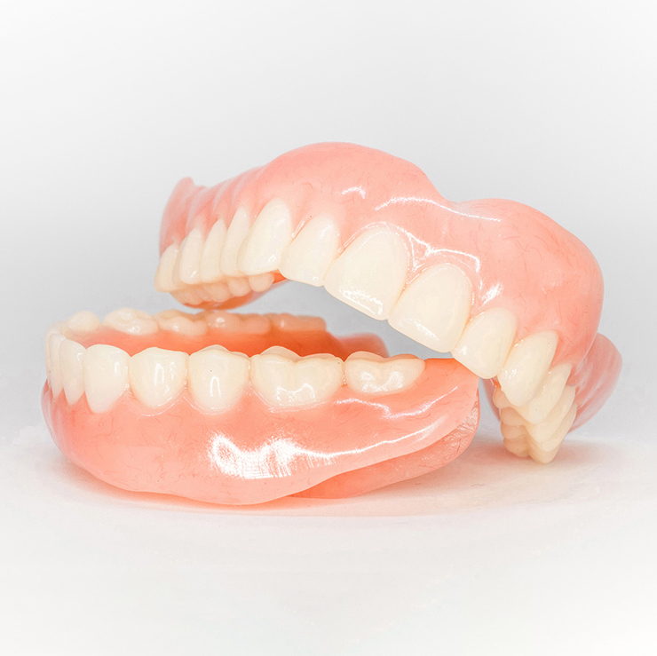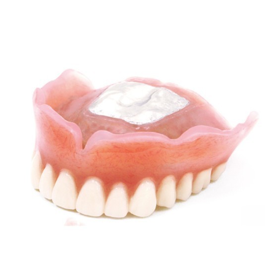 使用中の入れ歯をスキャンし、3Dプリント技術で作製するやわらかい総義歯です。裏側は生体用シリコーンというクッション素材で覆われています。噛んだ時の痛みが少ない、外れにくいという特徴があります。